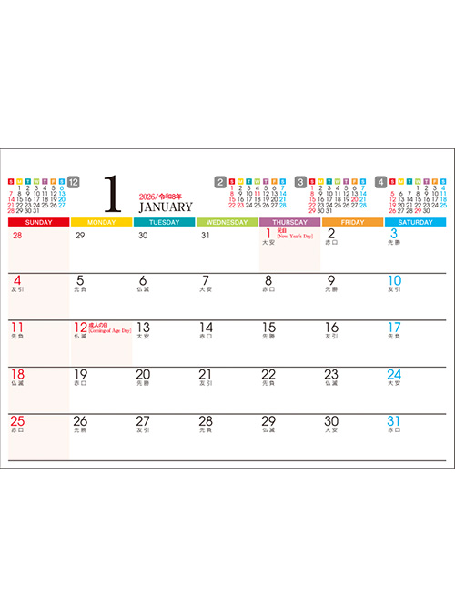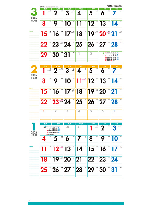 ミシン目入りで便利な3ヶ月文字 年間スケジュール表(年表)もついて実用性アップ!!